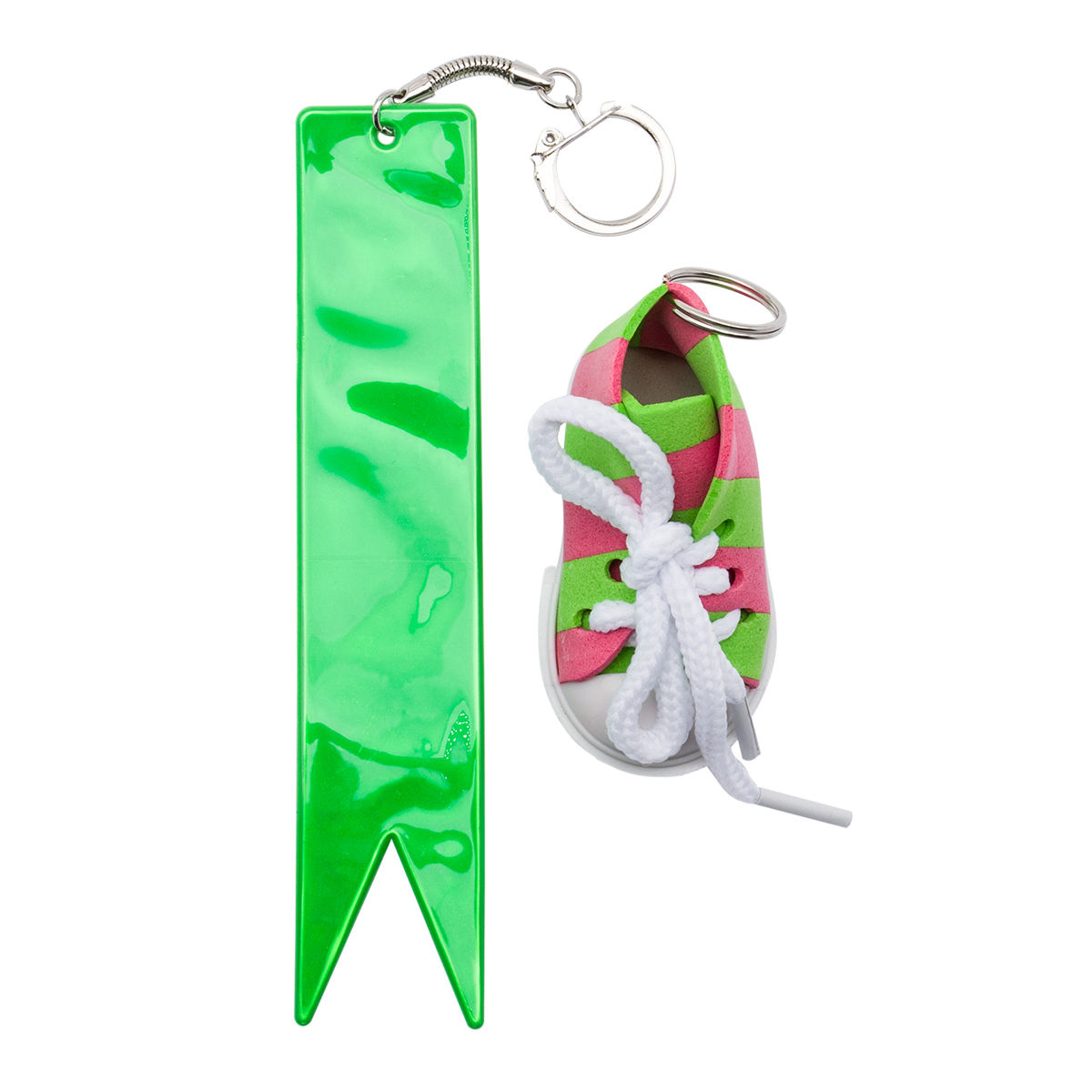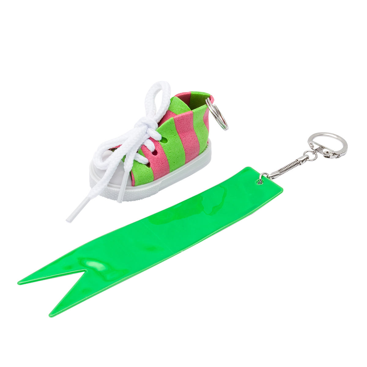 В наборе: кольцо для ключей 1,2х16 мм (1 шт.) и 18 мм (1 шт.), светоотражающая подвеска 'флажок' (1 шт.), кеда со шнурками для брелка 3х4х1 см, цвет розово-зеленый.