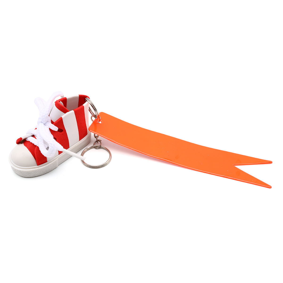 В наборе: кольцо для ключей 1,2х16 мм (1 шт.) и 18 мм (1 шт.), светоотражающая подвеска 'флажок' (1 шт.), кеда со шнурками для брелка 3х4х1 см, цвет красно-белый.