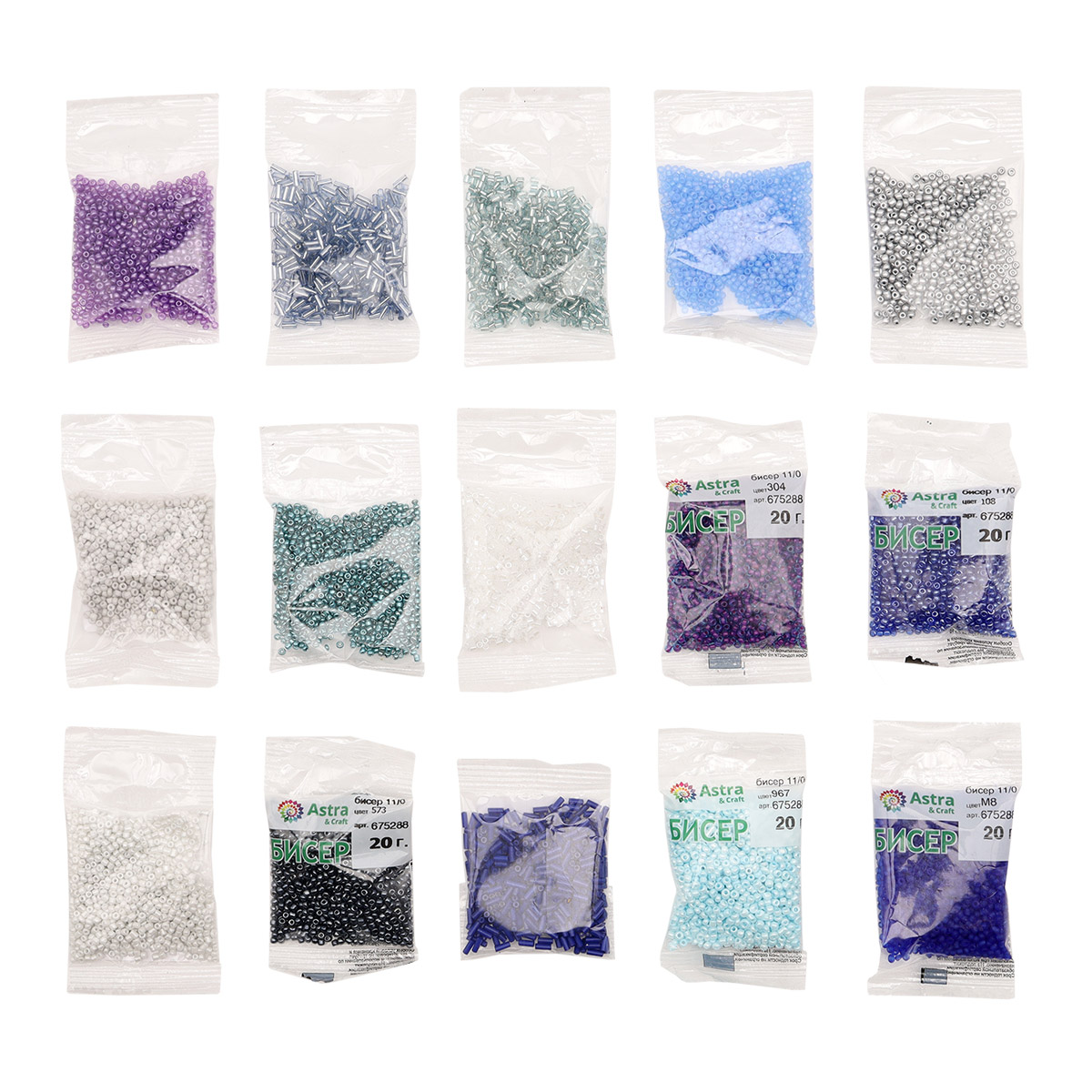 Набор №1 бисера, стекляруса, рубки 15 цв. 200 гр (10 цв. по 10 гр + 5 цв. по 20 гр), Astra&Craft