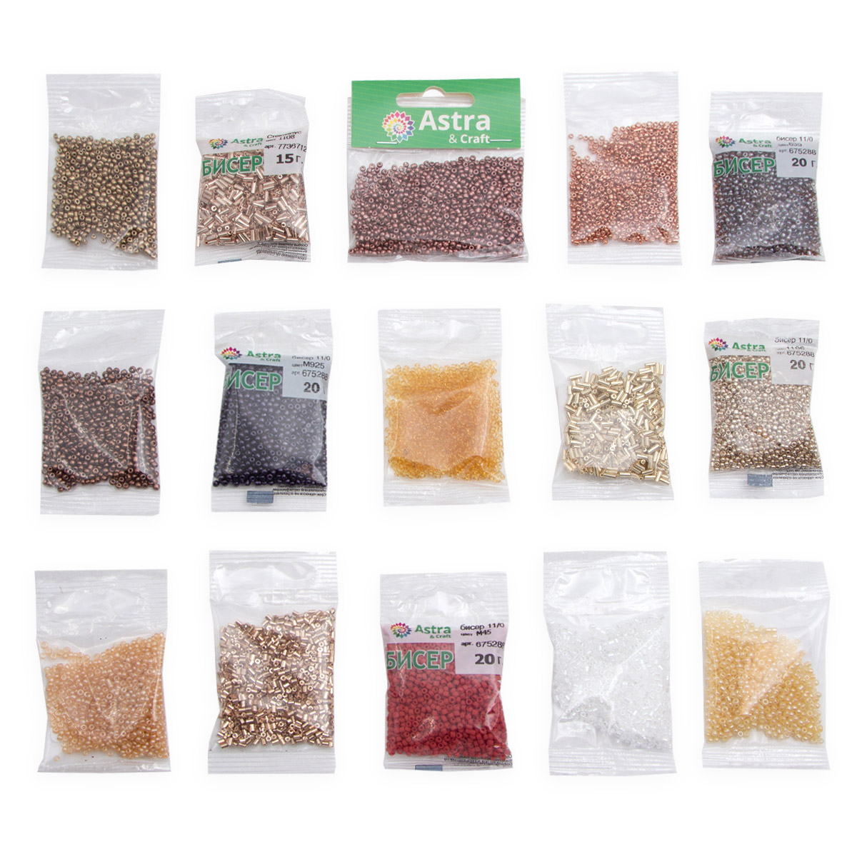 Набор №2 бисера, стекляруса, рубки 15 цв. 200 гр (10 цв. по 10 гр + 5 цв. по 20 гр), Astra&Craft