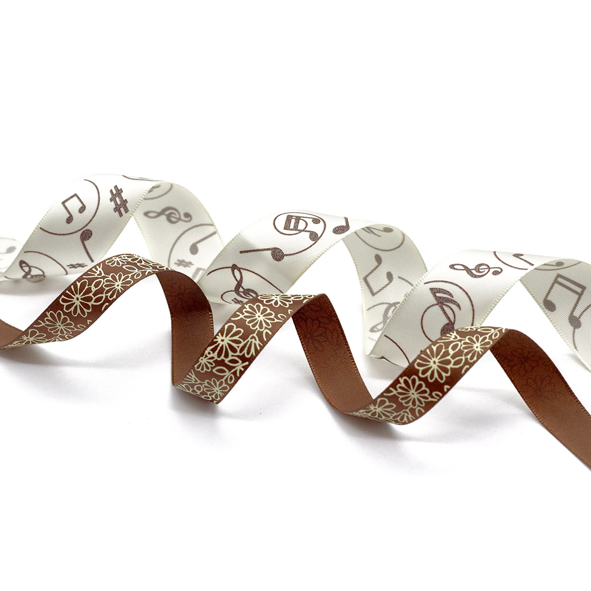 В наборе: ленты атласные с рисунком, ширина 1,3 см (2 шт.), ширина 22 мм (1 шт.) и 20 мм (1 шт.), лента репсовая с рисунком, ширина 1,5 см (1 шт.). Всего 5 шт. по 1 м каждая. Цвета: кремовый, белый, оранжевый.