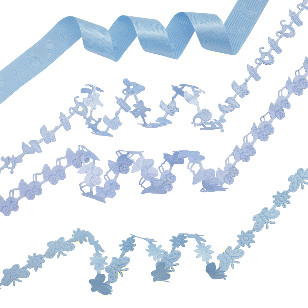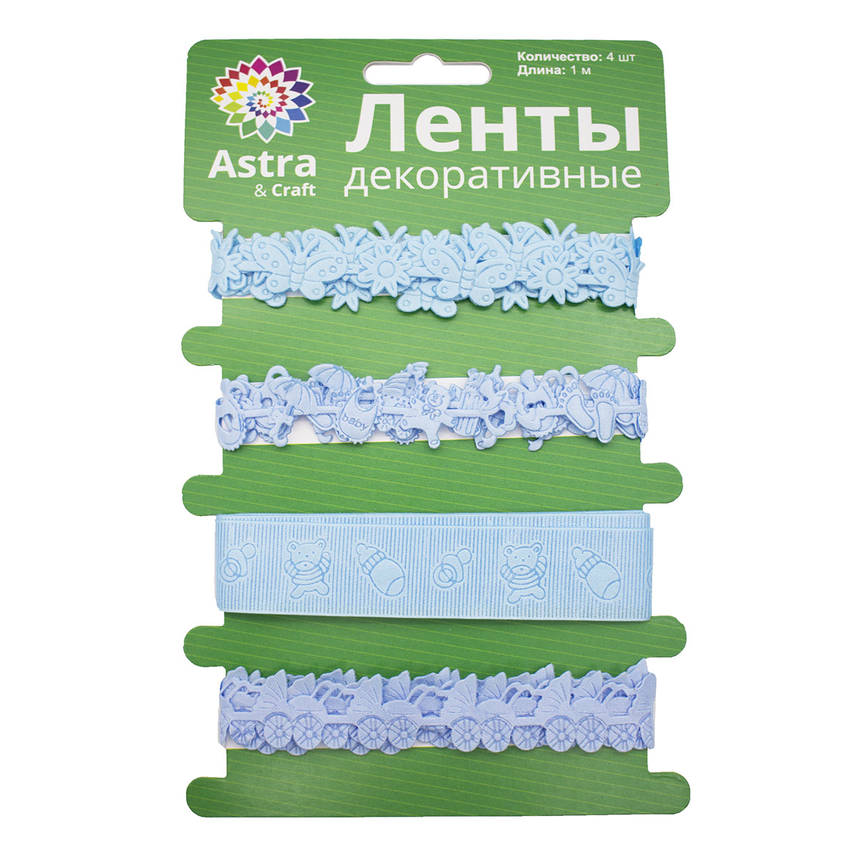 В наборе: лента однотонная ширина 22 мм, ленты фигурные 'Коляски' (ширина 19 мм), 'Мишка с сердцем' (ширина 16 мм), 'Бабочки' (ширина 17 мм), всего 4 шт. по 1 м.