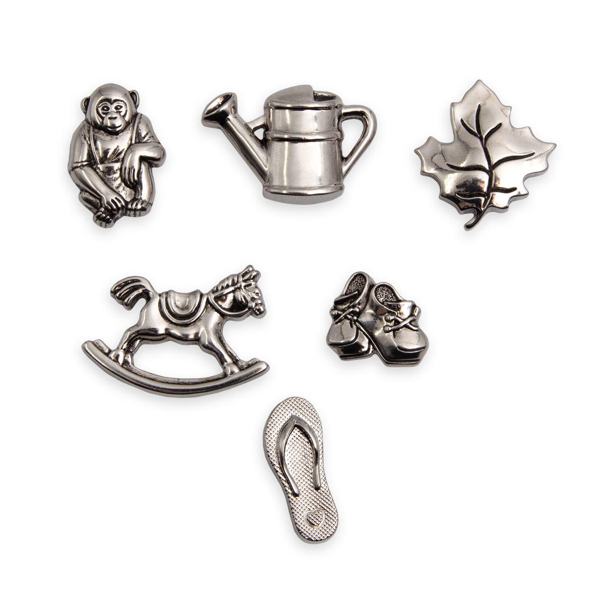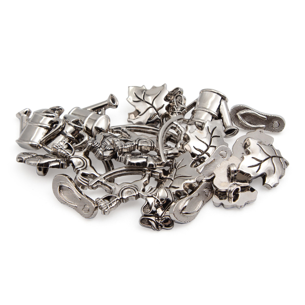 В наборе: декоративные пуговицы под металл 'Башмачки', 'Обезьяна', 'Паровоз', 'Велосипед', 'Вьетнамки', 'Машинка'. Размеры: 15-21 мм. Всего 24 шт., по 4 шт. для каждого вида.