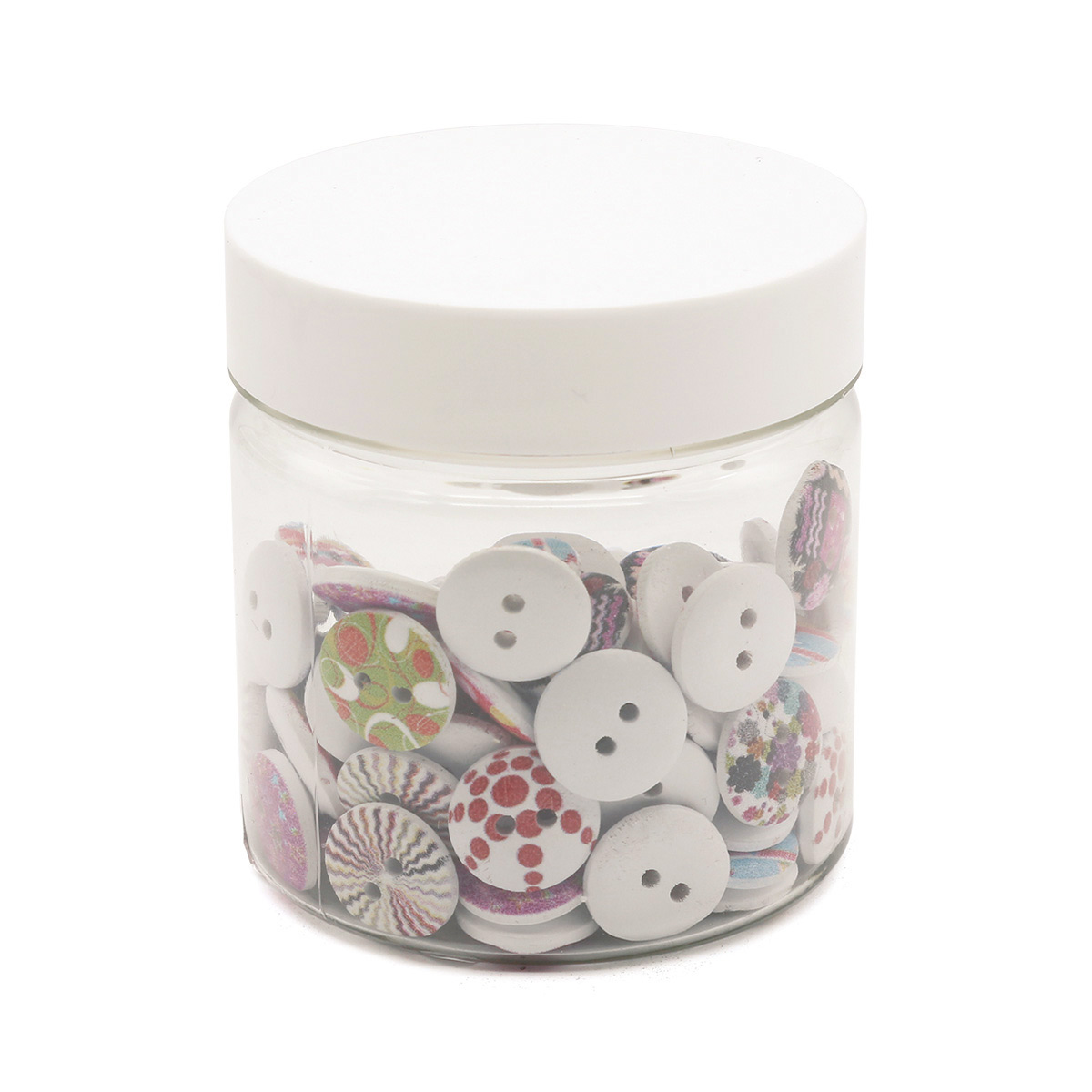 В наборе: пуговицы деревянные 'на прокол' с рисунком (10 видов), размер 15 мм, всего 100 штук; банка прозрачная ПЭТ, объем 150 мл; крышка белая винтовая, диаметр 58 мм.