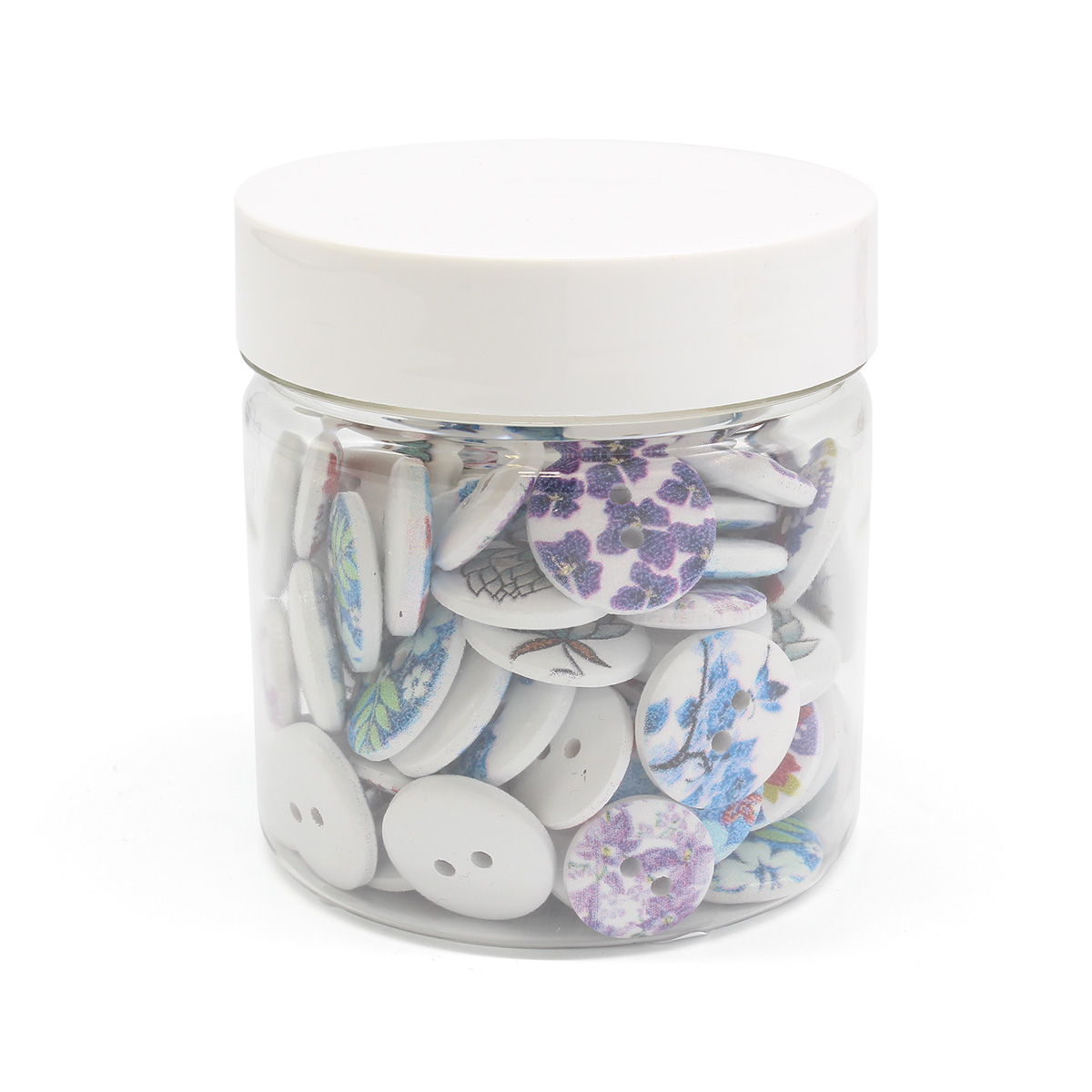 В наборе: пуговицы деревянные 'на прокол' с рисунком (10 видов), размер 15-18 мм, всего 100 штук; банка прозрачная ПЭТ, объем 150 мл; крышка белая винтовая, диаметр 58 мм.