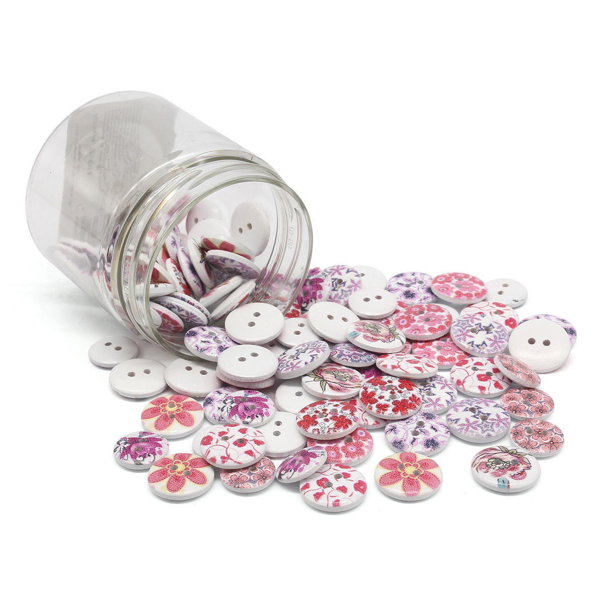 В наборе: пуговицы деревянные 'на прокол' с рисунком (10 видов), размер 15-18 мм, всего 100 штук; банка прозрачная ПЭТ, объем 150 мл; крышка белая винтовая, диаметр 58 мм.