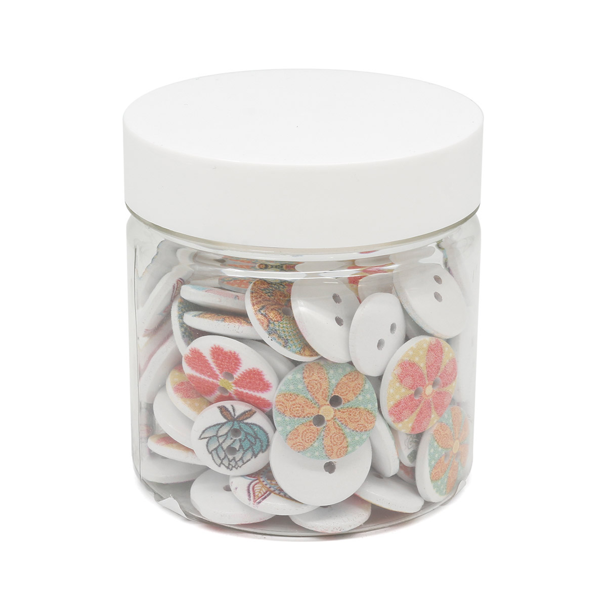 В наборе: пуговицы деревянные 'на прокол' с рисунком (10 видов), размер 15-18 мм, всего 100 штук; банка прозрачная ПЭТ, объем 150 мл; крышка белая винтовая, диаметр 58 мм.
