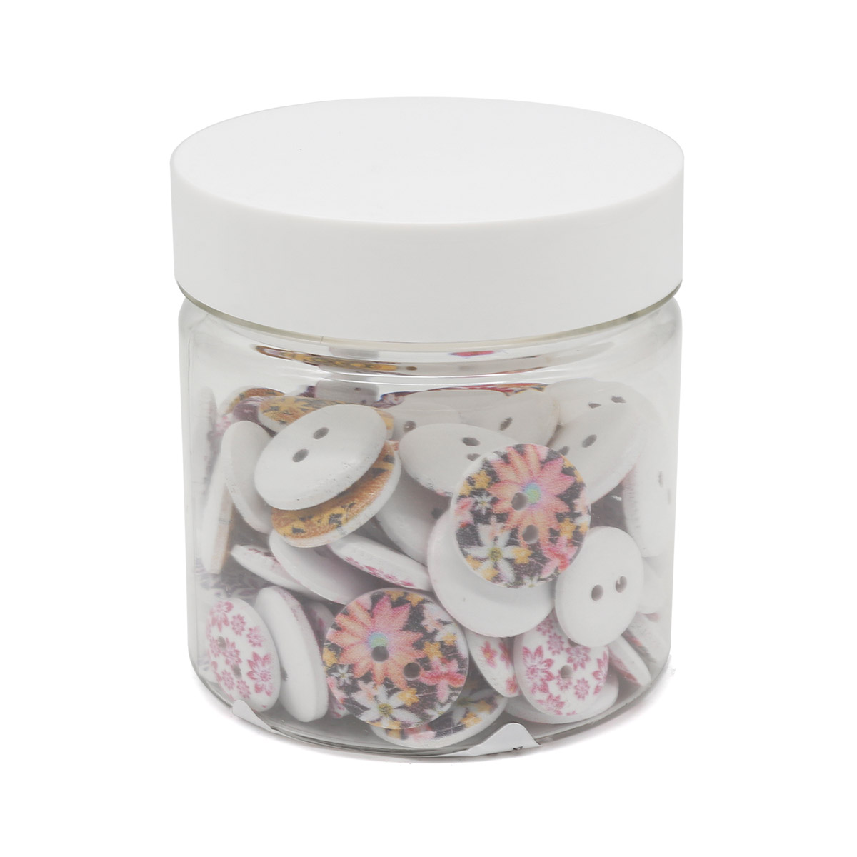 В наборе: пуговицы деревянные 'на прокол' с рисунком (10 видов), размер 15-18 мм, всего 100 штук; банка прозрачная ПЭТ, объем 150 мл; крышка белая винтовая, диаметр 58 мм.