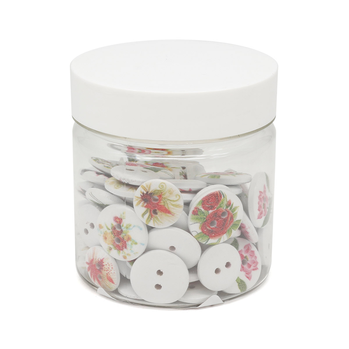 В наборе: пуговицы деревянные 'на прокол' с рисунком (10 видов), размер 15-18 мм, всего 100 штук; банка прозрачная ПЭТ, объем 150 мл; крышка белая винтовая, диаметр 58 мм.