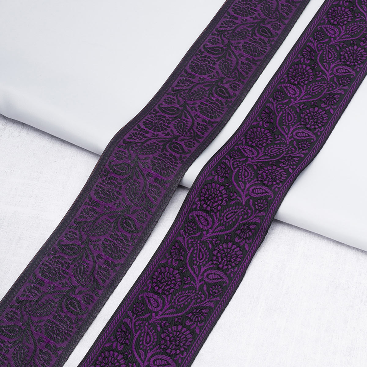 Жаккардовая лента-тесьма имеет объемный плетеный узор, напоминающий вышивку. Поскольку рисунок образуется переплетением нитей, а не наносится на готовую ткань, он никогда не поблекнет и не сотрется.