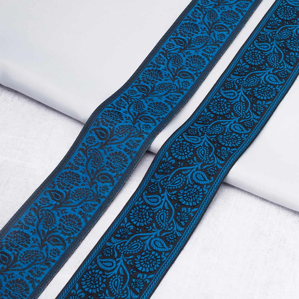 Жаккардовая лента-тесьма имеет объемный плетеный узор, напоминающий вышивку. Поскольку рисунок образуется переплетением нитей, а не наносится на готовую ткань, он никогда не поблекнет и не сотрется.
