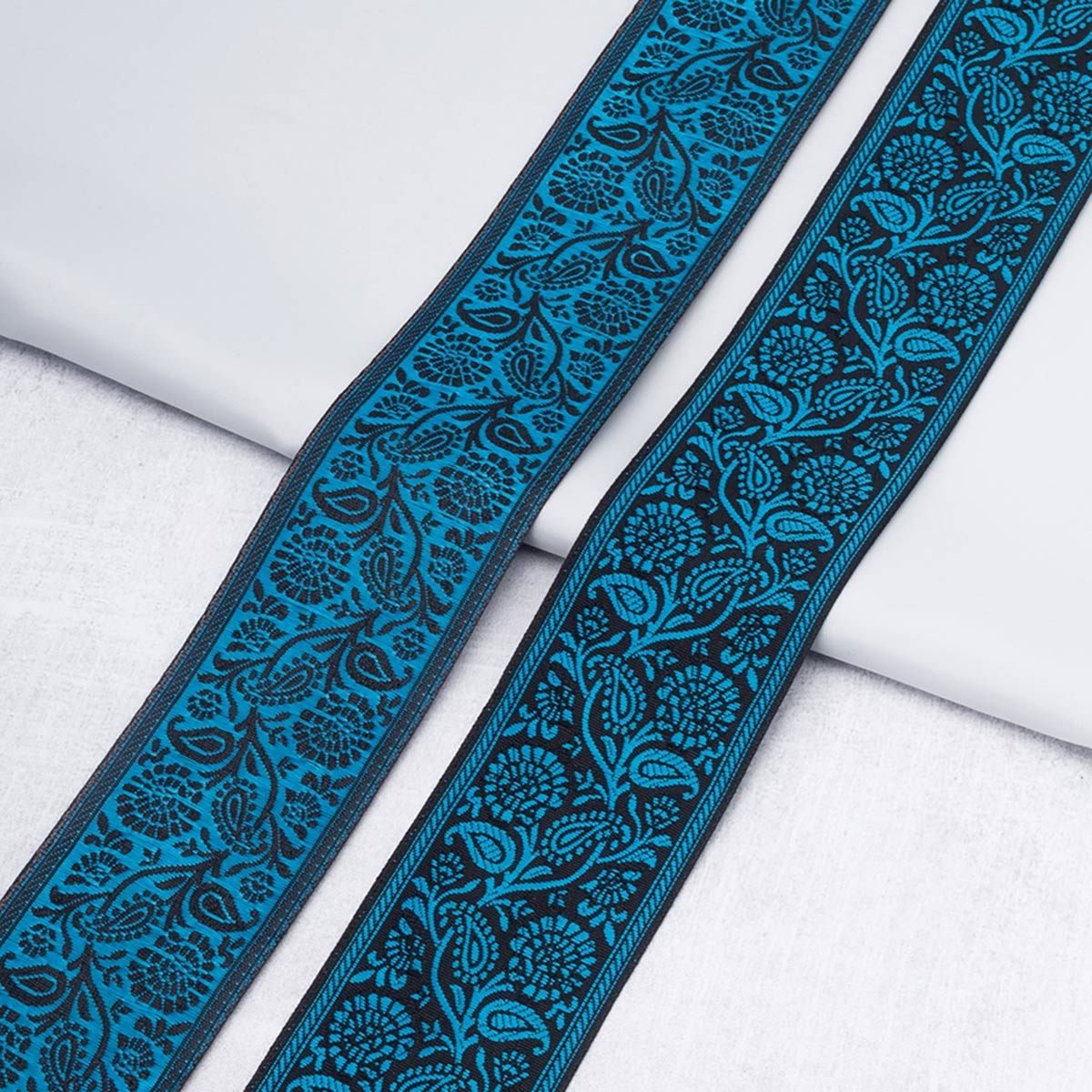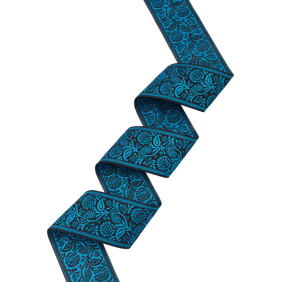 Жаккардовая лента-тесьма имеет объемный плетеный узор, напоминающий вышивку. Поскольку рисунок образуется переплетением нитей, а не наносится на готовую ткань, он никогда не поблекнет и не сотрется.