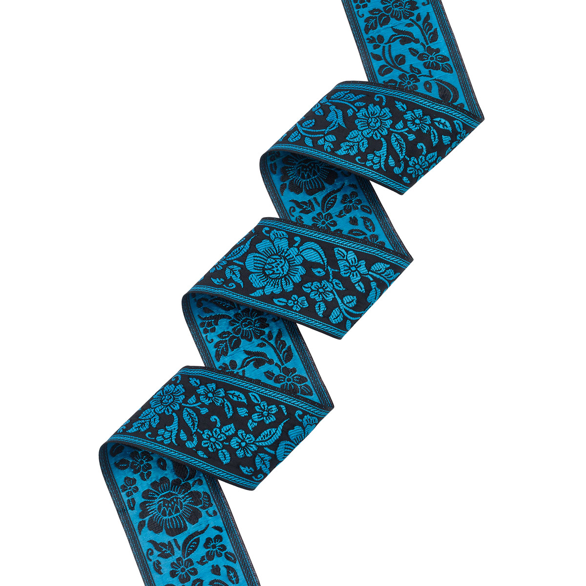 Жаккардовая лента-тесьма имеет объемный плетеный узор, напоминающий вышивку. Поскольку рисунок образуется переплетением нитей, а не наносится на готовую ткань, он никогда не поблекнет и не сотрется.