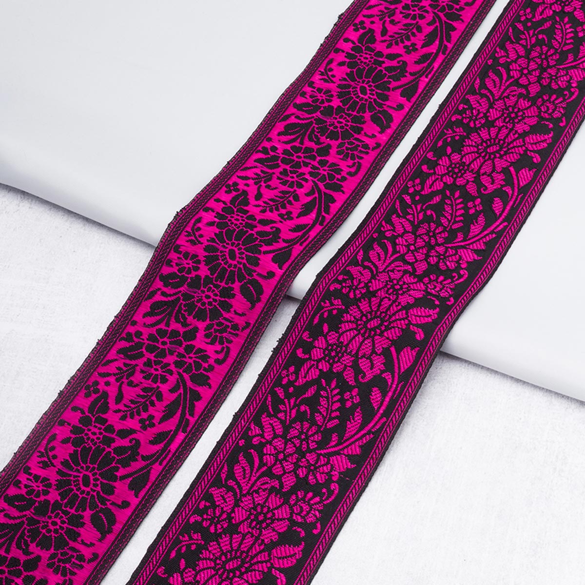 Жаккардовая лента-тесьма имеет объемный плетеный узор, напоминающий вышивку. Поскольку рисунок образуется переплетением нитей, а не наносится на готовую ткань, он никогда не поблекнет и не сотрется.