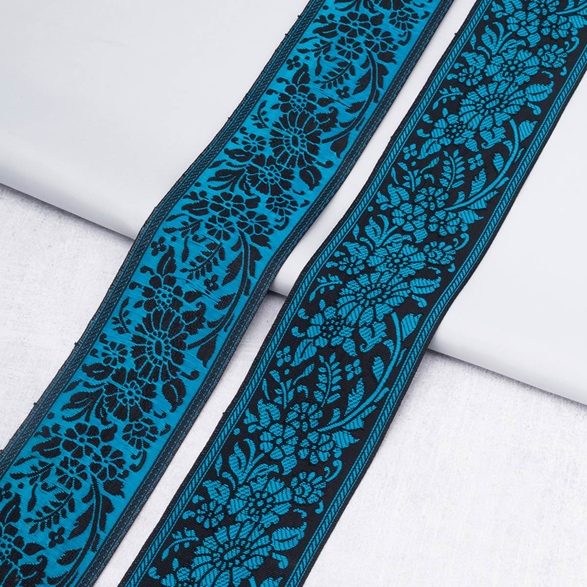 Жаккардовая лента-тесьма имеет объемный плетеный узор, напоминающий вышивку. Поскольку рисунок образуется переплетением нитей, а не наносится на готовую ткань, он никогда не поблекнет и не сотрется.