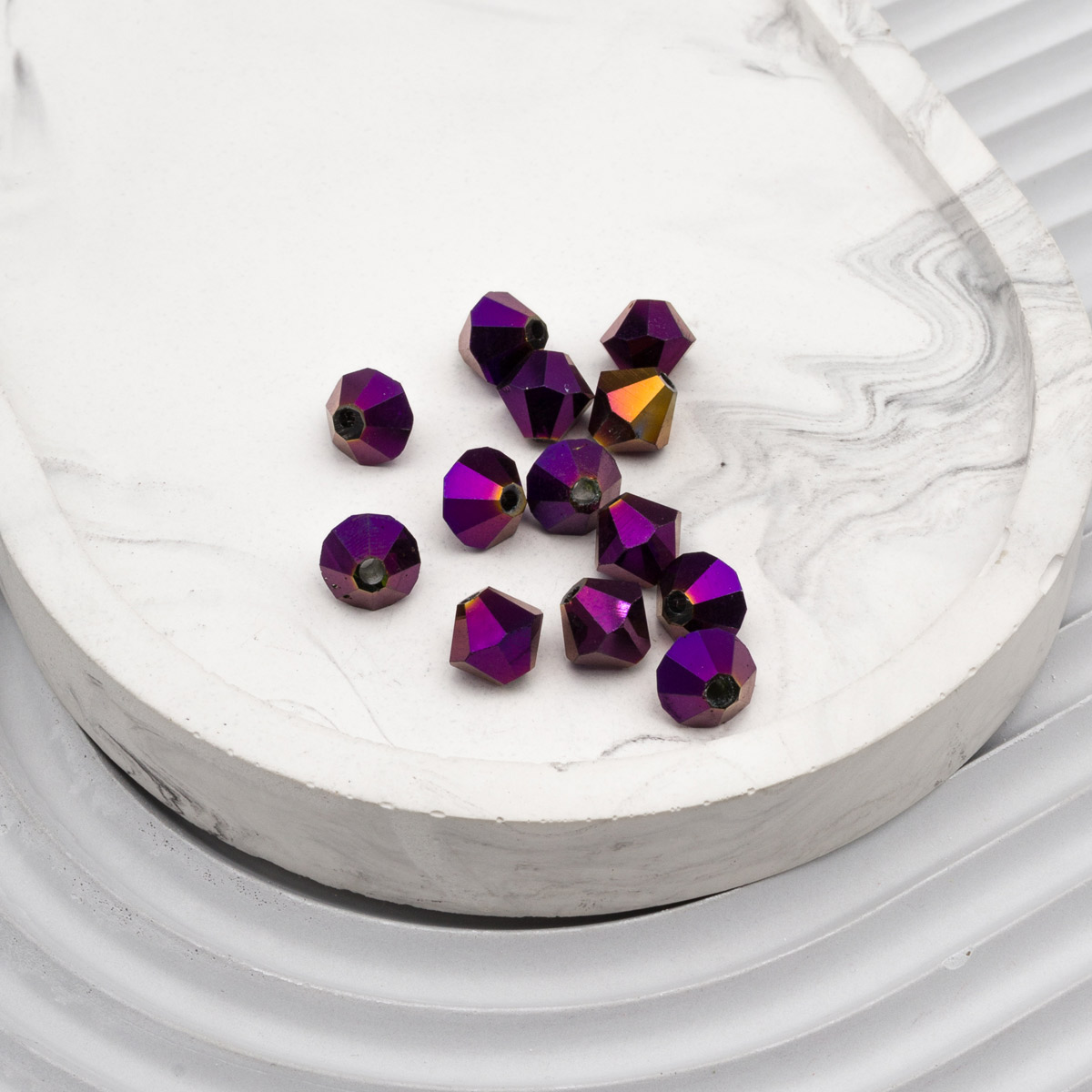 Граненые бусины из цветного стекла с гальваникой – качественная основа для украшений. Огранка 'биконус' подчеркивает блеск стекла, а гальваническая обработка создает необычный зеркальный эффект с цветными бликами. Украшения из таких бусин подчеркнут ваш образ и не останутся без внимания.