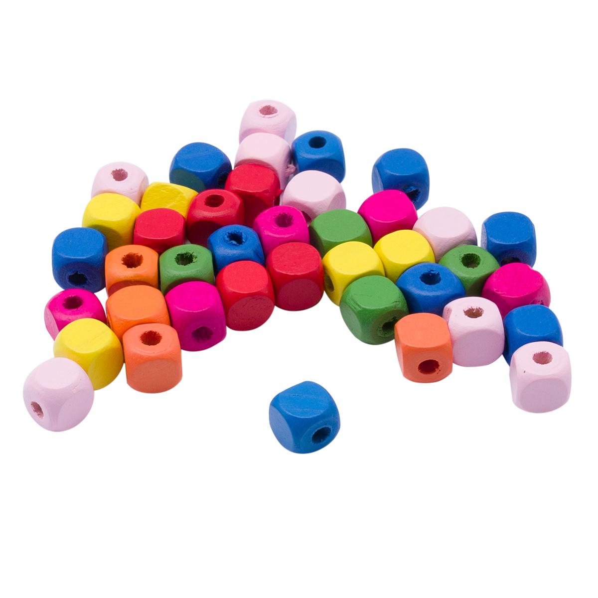 Гладкие деревянные бусины кубической формы, окрашены в разные цвета. Подходят для создания яркой детской бижутерии (браслетов, бус, серег), оригинальных украшений для волос, а также гирлянд, елочных игрушек и других поделок – все зависит от вашей фантазии! Для нанизывания рекомендуется использовать прочные нитки – джутовые, льняные, синтетические, с армированием.