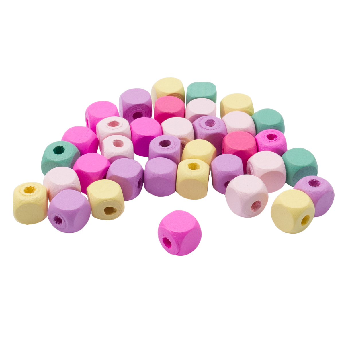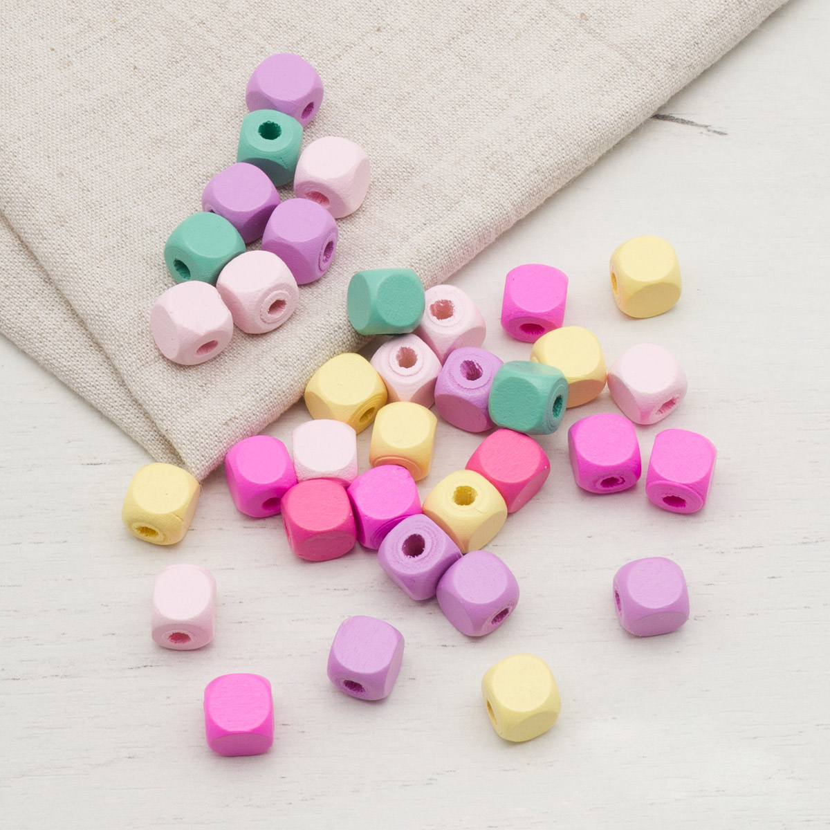Гладкие деревянные бусины кубической формы, окрашены в разные цвета. Подходят для создания яркой детской бижутерии (браслетов, бус, серег), оригинальных украшений для волос, а также гирлянд, елочных игрушек и других поделок – все зависит от вашей фантазии! Для нанизывания рекомендуется использовать прочные нитки – джутовые, льняные, синтетические, с армированием.