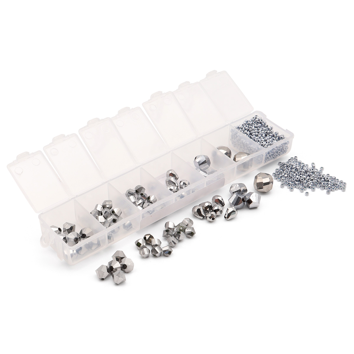 Набор упакован в прозрачный пластиковый контейнер на 7 ячеек, который обеспечивает удобное хранение и транспортировку бусин, а также позволяет оценить их количество и цветовую палитру. Семь ячеек дают возможность сортировать бусины по размеру или форме огранки.