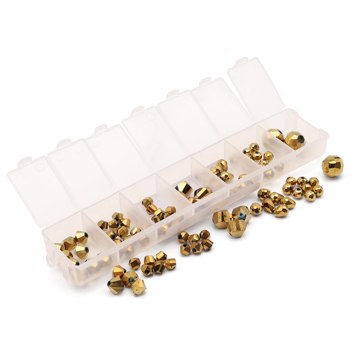 Набор упакован в прозрачный пластиковый контейнер на 7 ячеек, который обеспечивает удобное хранение и транспортировку бусин, а также позволяет оценить их количество и цветовую палитру. Семь ячеек дают возможность сортировать бусины по размеру или форме огранки.