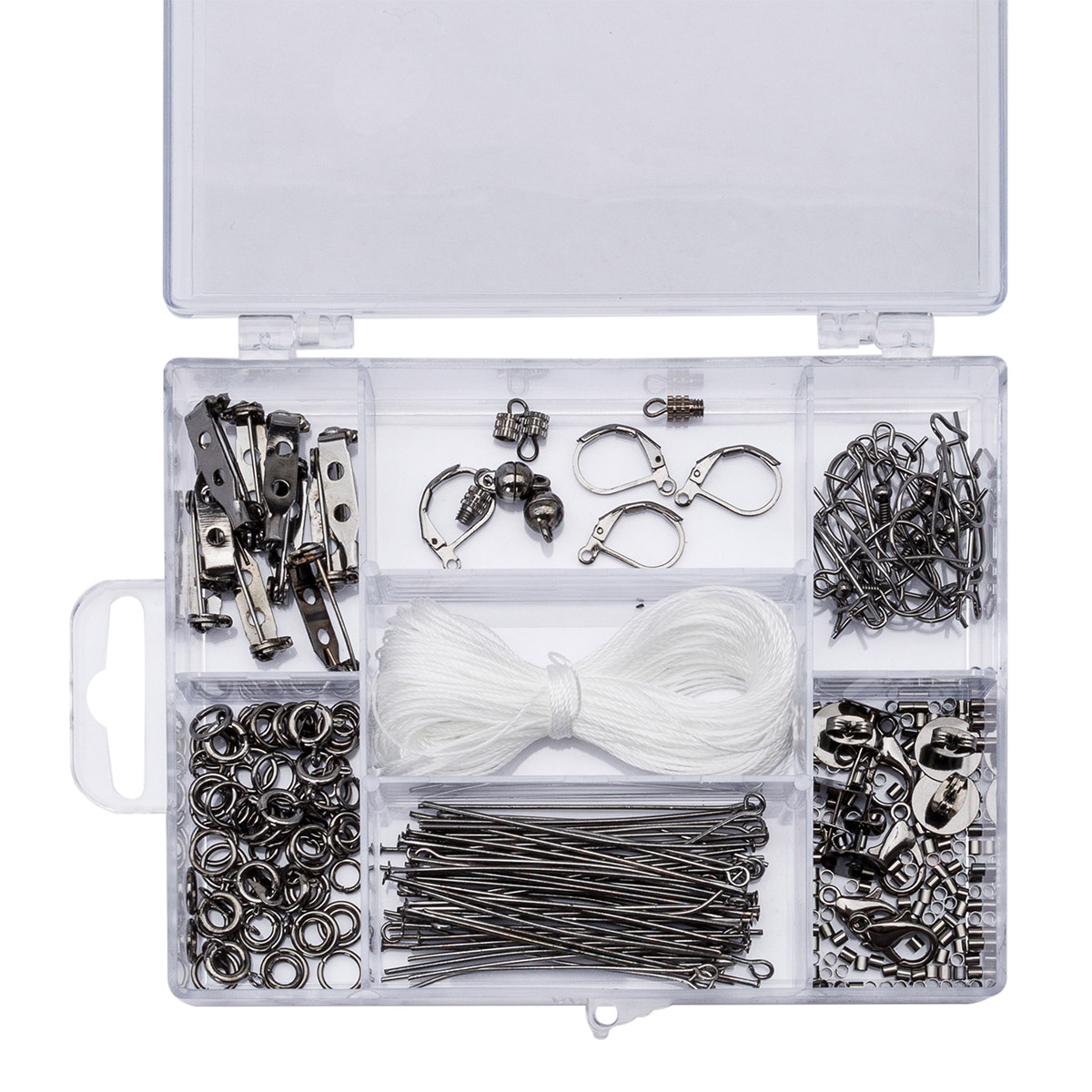 В наборе: швензы-петли с французской застежкой для сережек 20,4 мм, швензы-крючок для сережек 19,4 мм, основа для броши и значка 20,5x4,6 мм, пины (штифты) со шляпкой 51,5 мм, замок-винтовой 12,9 мм, замок-карабин 14,6 мм, швензы-гвоздики (пусеты) 11,8x10 мм, швензы - левербек 13,1 мм, пины (штифты) с петелькой 50,2 мм, застежка магнитная 10,1 мм, соединительные кольца d 5,4 мм, замок карабин (шпрингель) 13,6x10,2 мм, кримпы 2,5 мм, соединительные кольца d 7,6 мм, нить нейлоновая 18,5 м, футляр из прозрачного пластика с отсеками и крышкой.