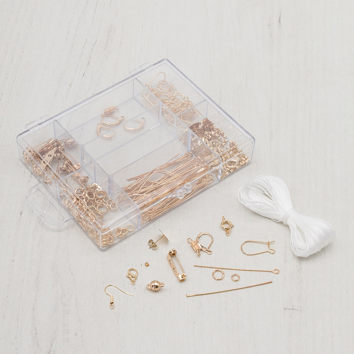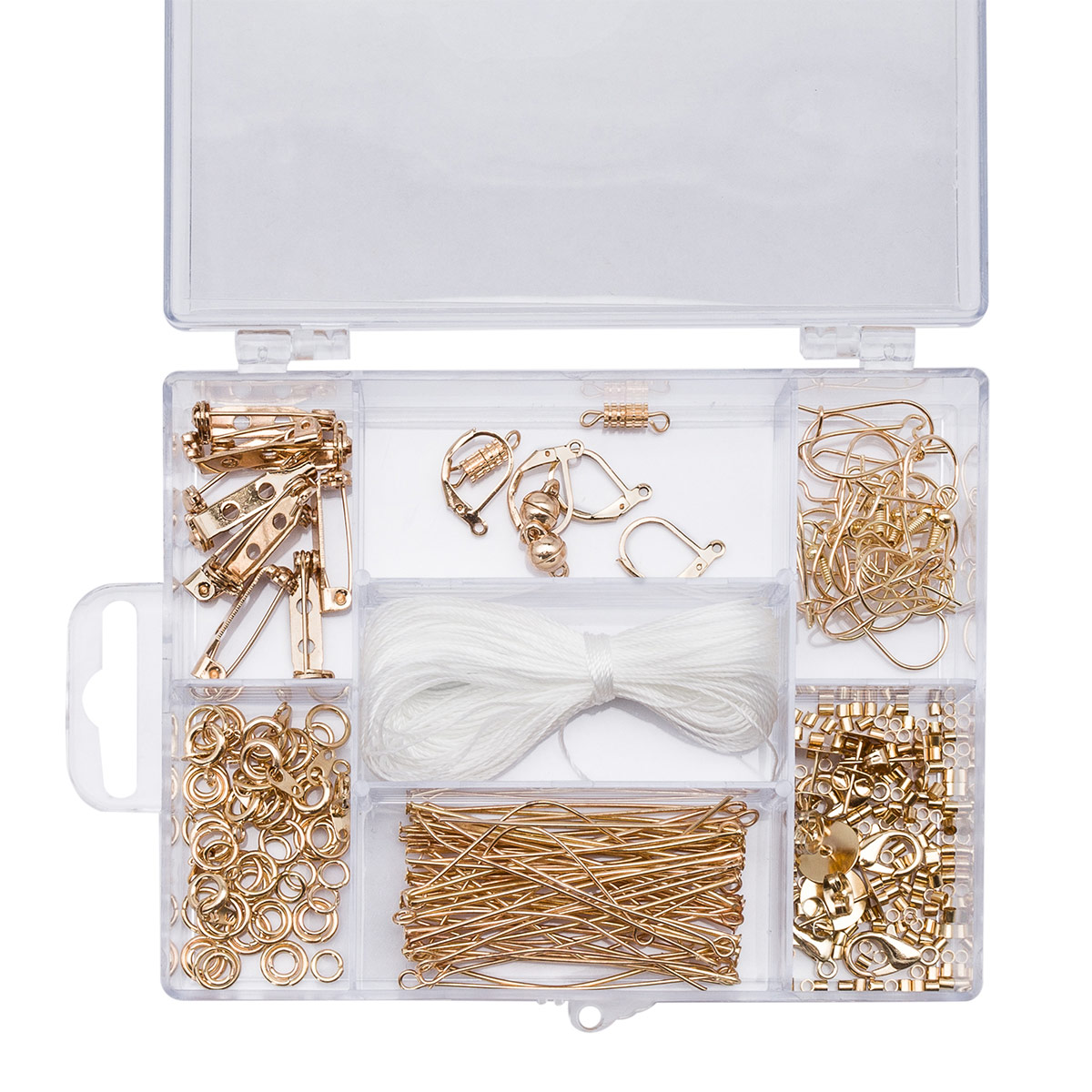 В наборе: швензы-петли с французской застежкой для сережек 20,4 мм, швензы-крючок для сережек 19,4 мм, основа для броши и значка 20,5x4,6 мм, пины (штифты) со шляпкой 51,5 мм, замок-винтовой 12,9 мм, замок-карабин 14,6 мм, швензы-гвоздики (пусеты) 11,8x10 мм, швензы - левербек 13,1 мм, пины (штифты) с петелькой 50,2 мм, застежка магнитная 10,1 мм, соединительные кольца d 5,4 мм, замок карабин (шпрингель) 13,6x10,2 мм, кримпы 2,5 мм, соединительные кольца d 7,6 мм, нить нейлоновая 18,5 м, футляр из прозрачного пластика с отсеками и крышкой.