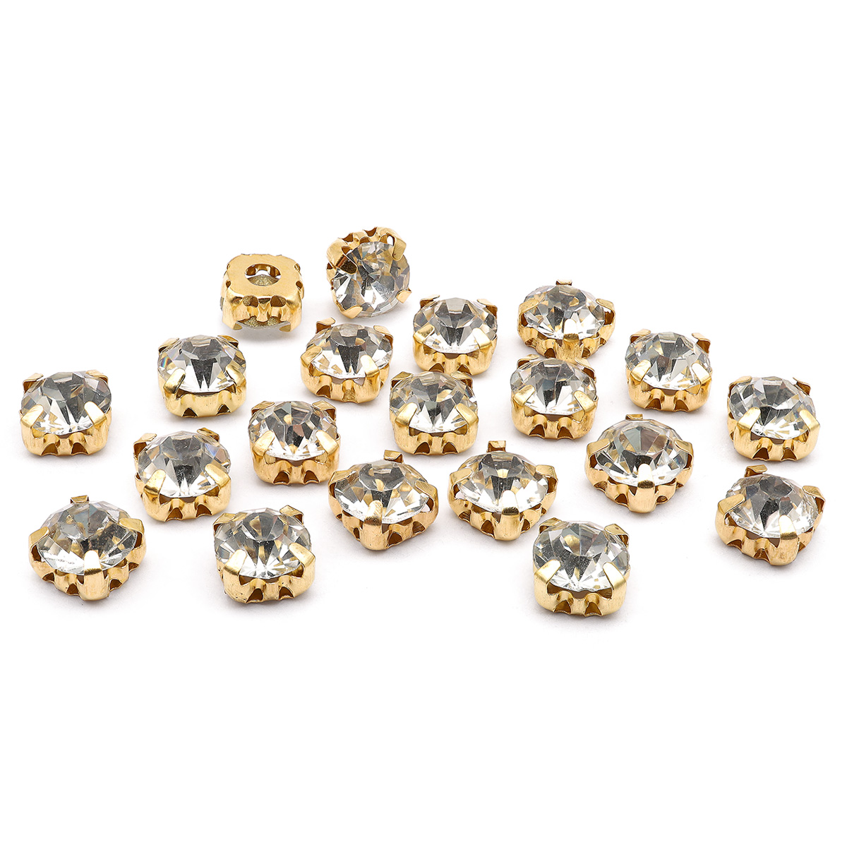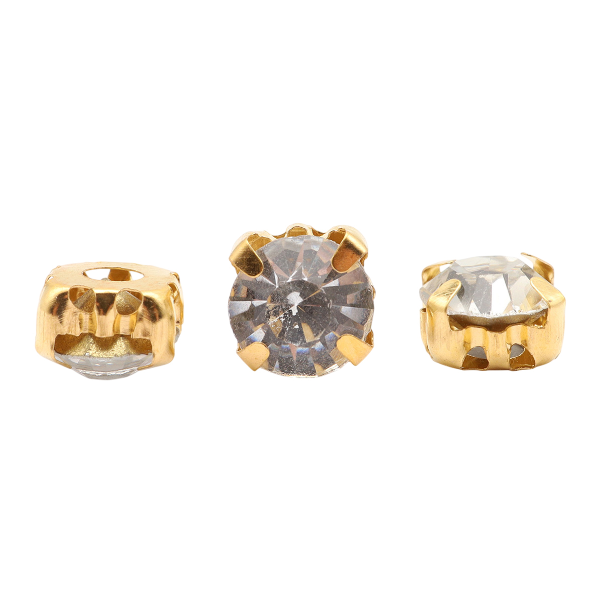 Золотистые цапы служат оправой: они закрывают стразы с обратной стороны, слегка обрамляют их снаружи и придают граненому камню дополнительное сияние.