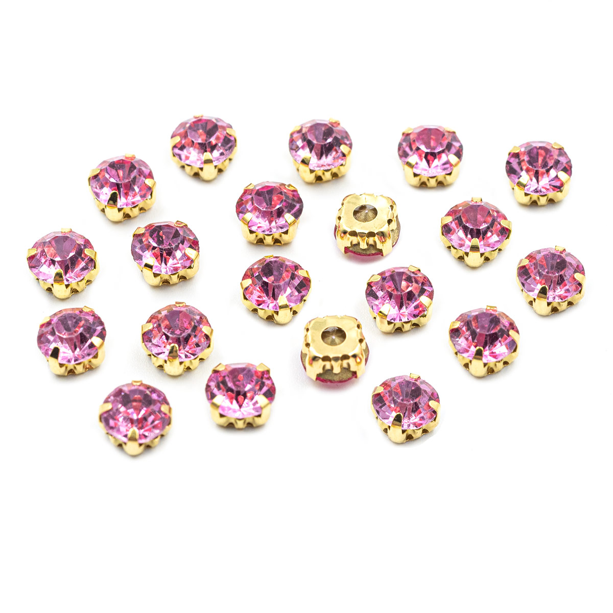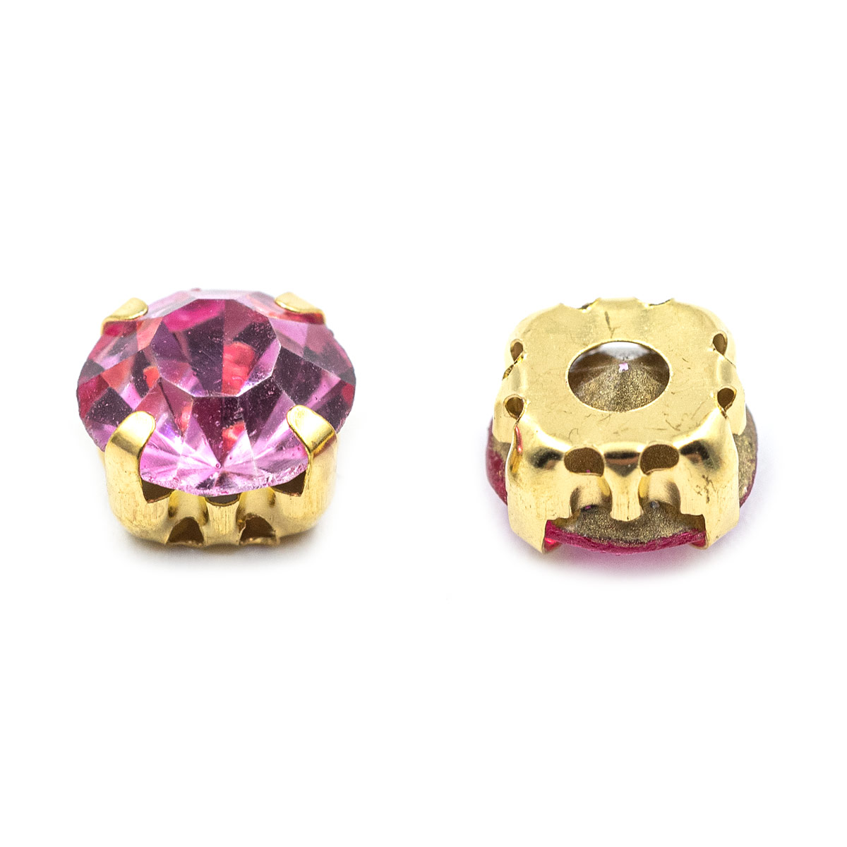 Золотистые цапы служат оправой: они закрывают стразы с обратной стороны, слегка обрамляют их снаружи и придают граненому камню дополнительное сияние.