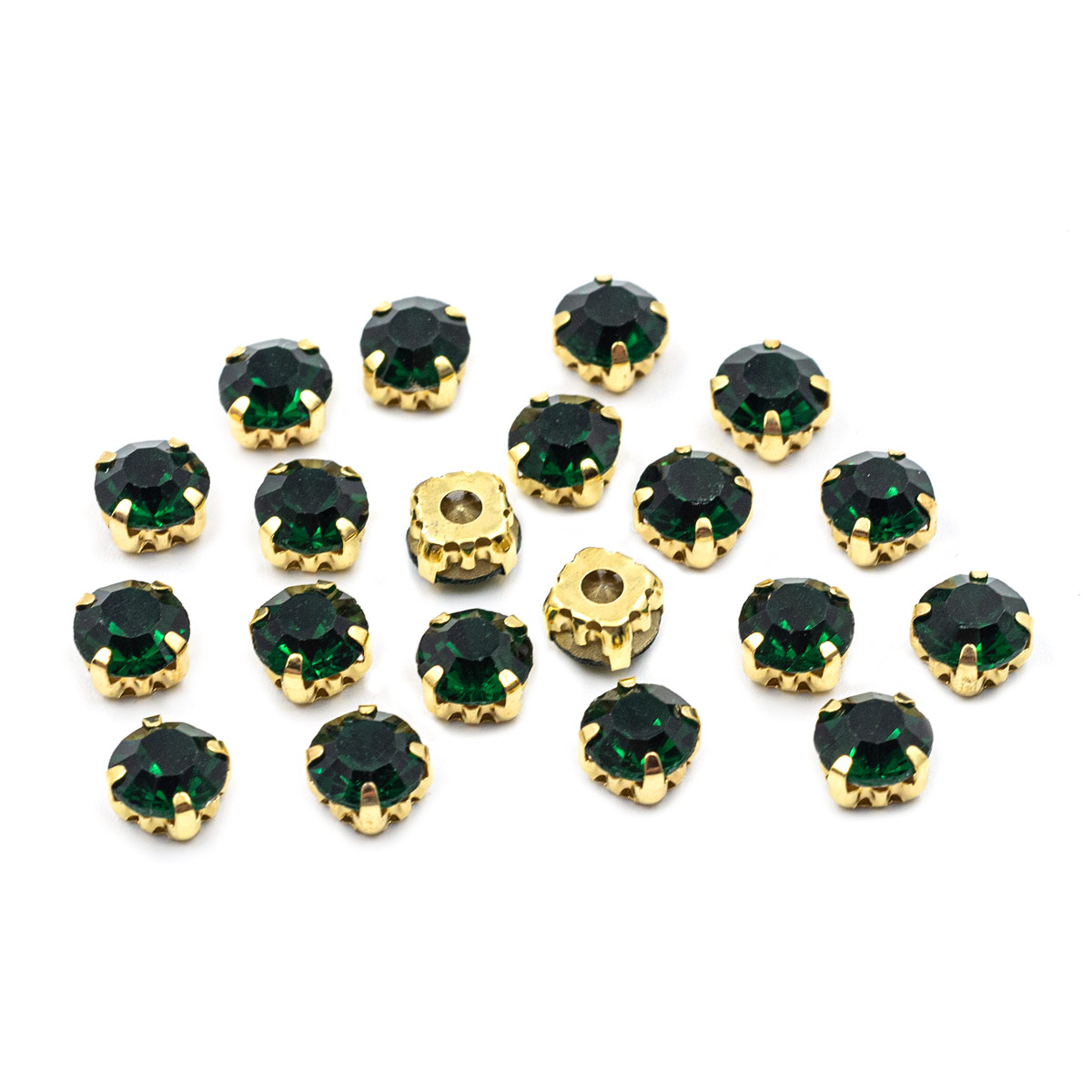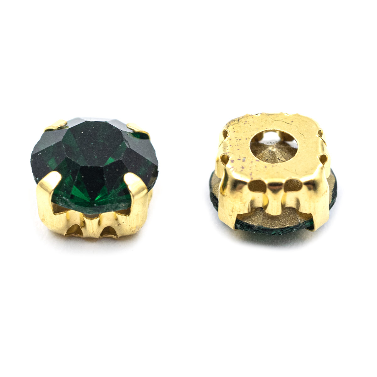 Золотистые цапы служат оправой: они закрывают стразы с обратной стороны, слегка обрамляют их снаружи и придают граненому камню дополнительное сияние.