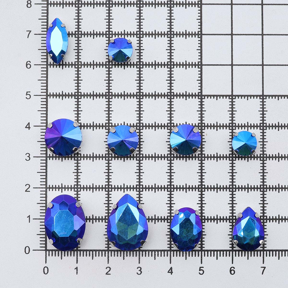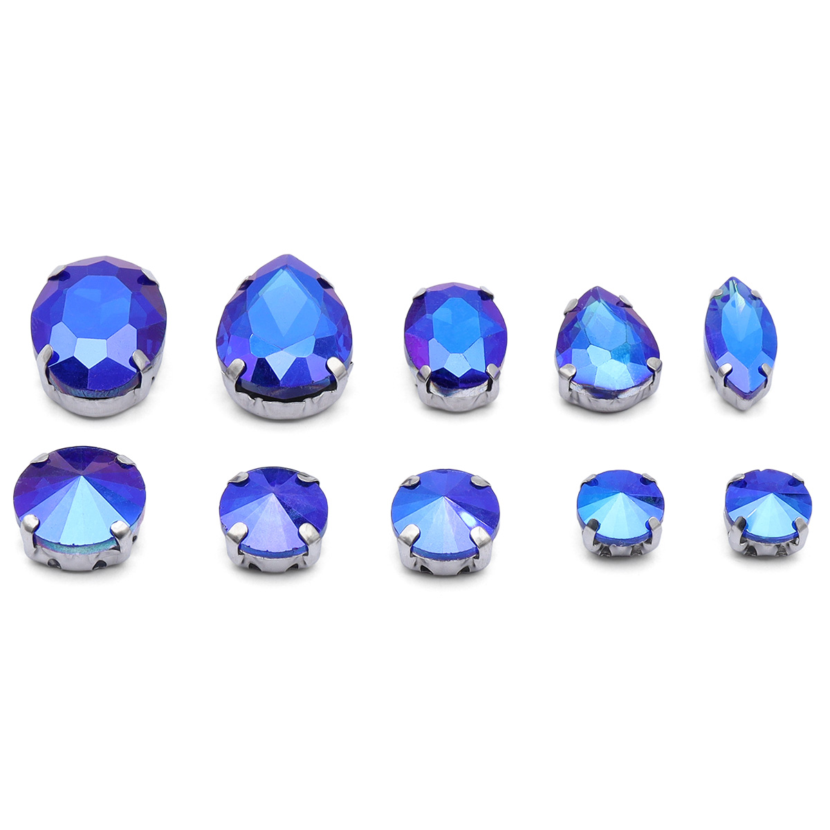 МФ-28 Хрустальные стразы в металлических цапах, форма страз: МИКС, синий с AB покрытием, 10шт/упак