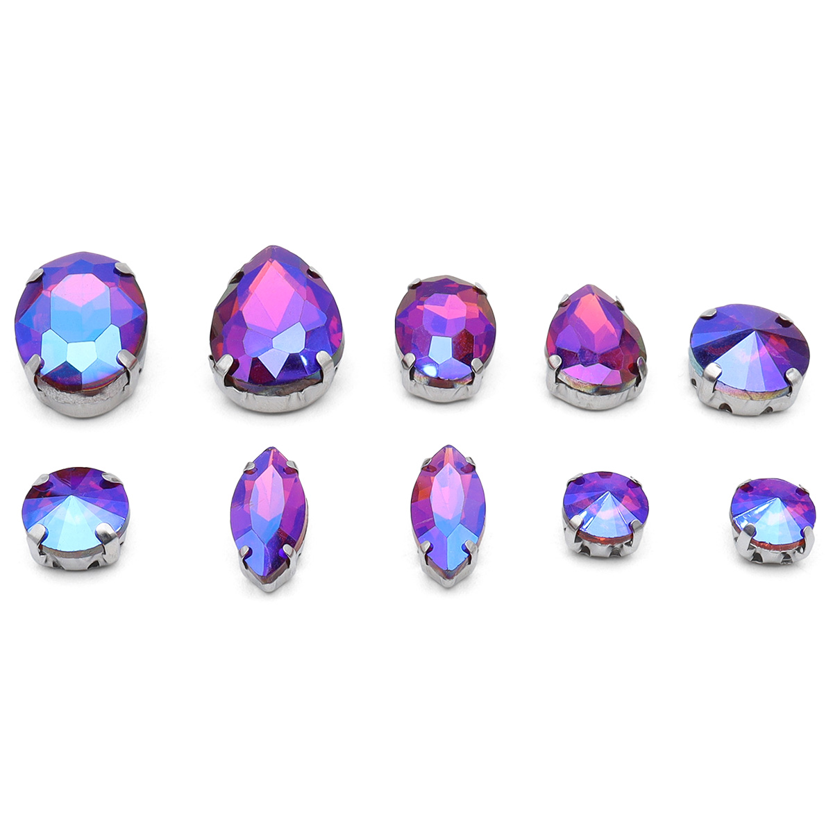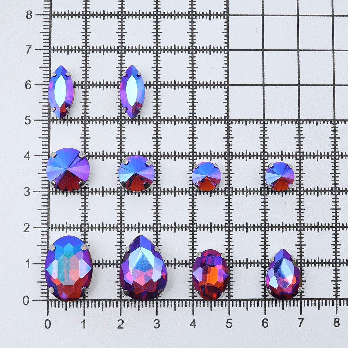 Размеры: стразы 'капля' 6х10 мм, 10х14 мм, 13х14 мм, стразы 'овал' 10х14 мм, 13х18 мм, стразы 'наветт' (миндаль) 7х15 мм, стразы прямоугольные 10х14 мм, 13х18 мм, треугольные стразы 12 мм, стразы круглые 'риволи' 8 мм, 10 мм, 12 мм.