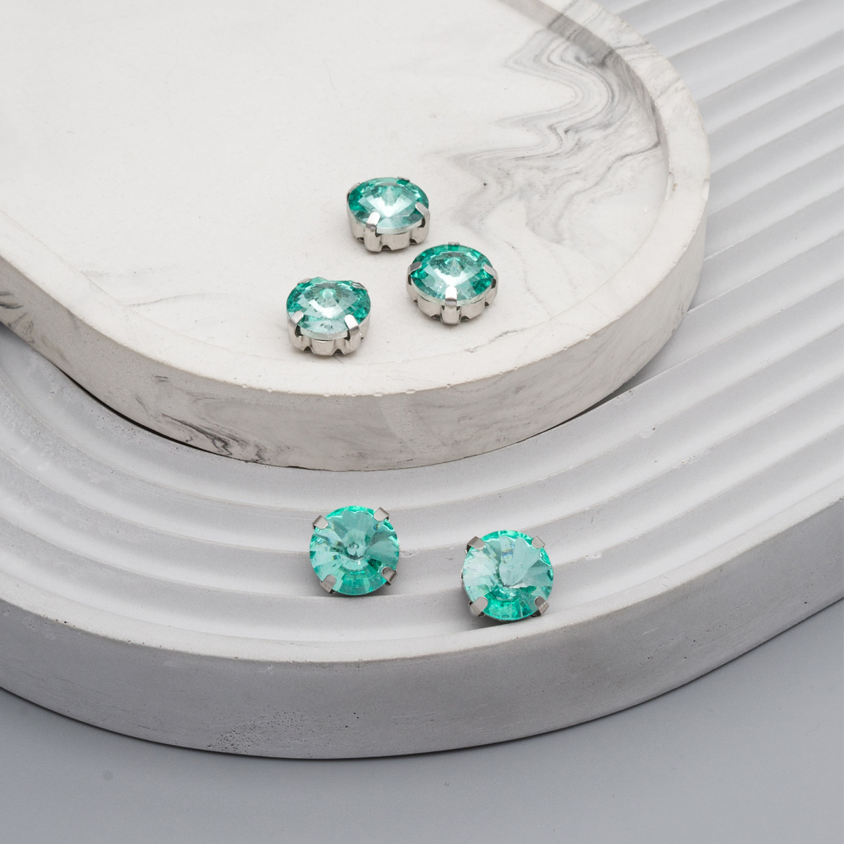 Стразы в металлических цапах круглой формы огранки 'риволи' изготовлены из хрусталя. Он отражает свет лучше обычного стекла и напоминает драгоценные камни. Стразы из хрустального стекла ярко мерцают, сохраняют насыщенный цвет и устойчивы к царапинам.