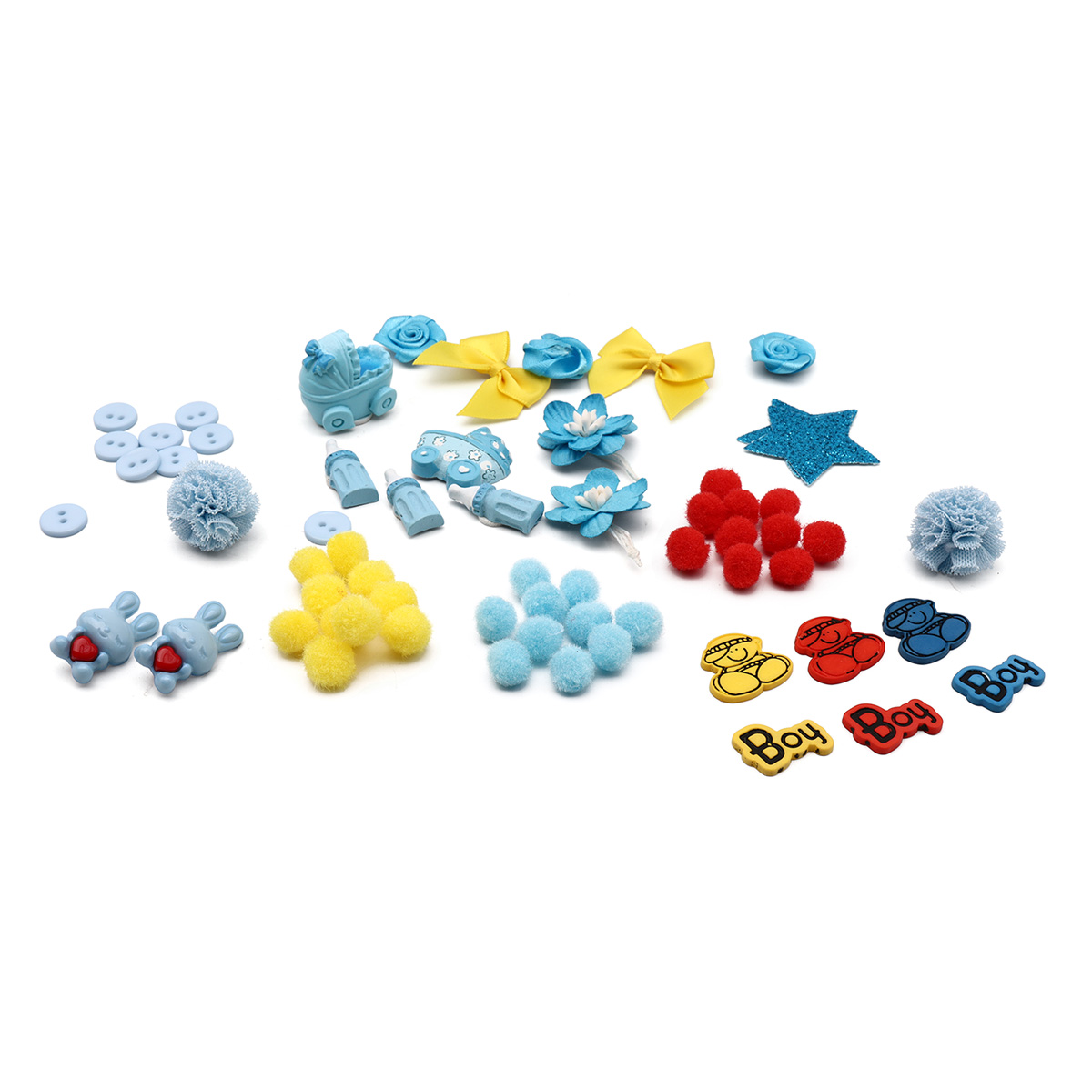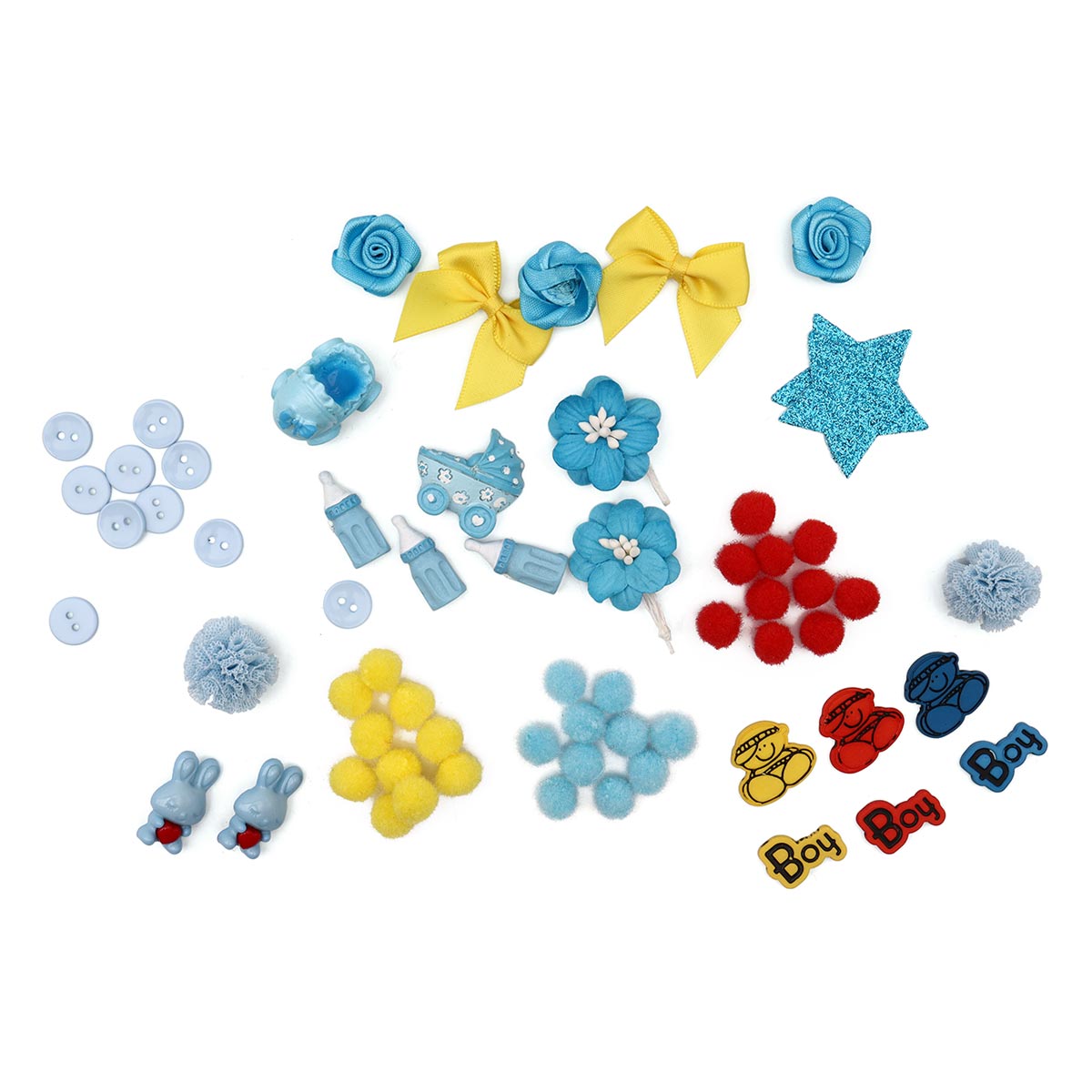 В наборе: пришивные бантики, пришивные цветы, пластиковые декоративные элементы из пластика, элементы из ткани, объемные фигурки со стикерами, помпоны, пуговицы.