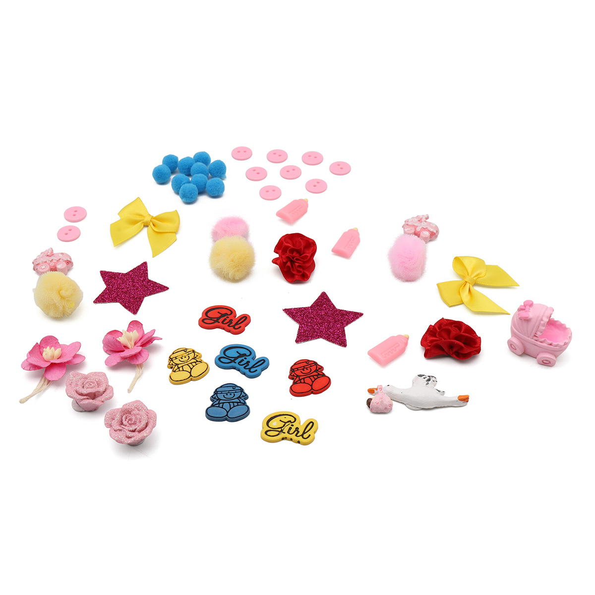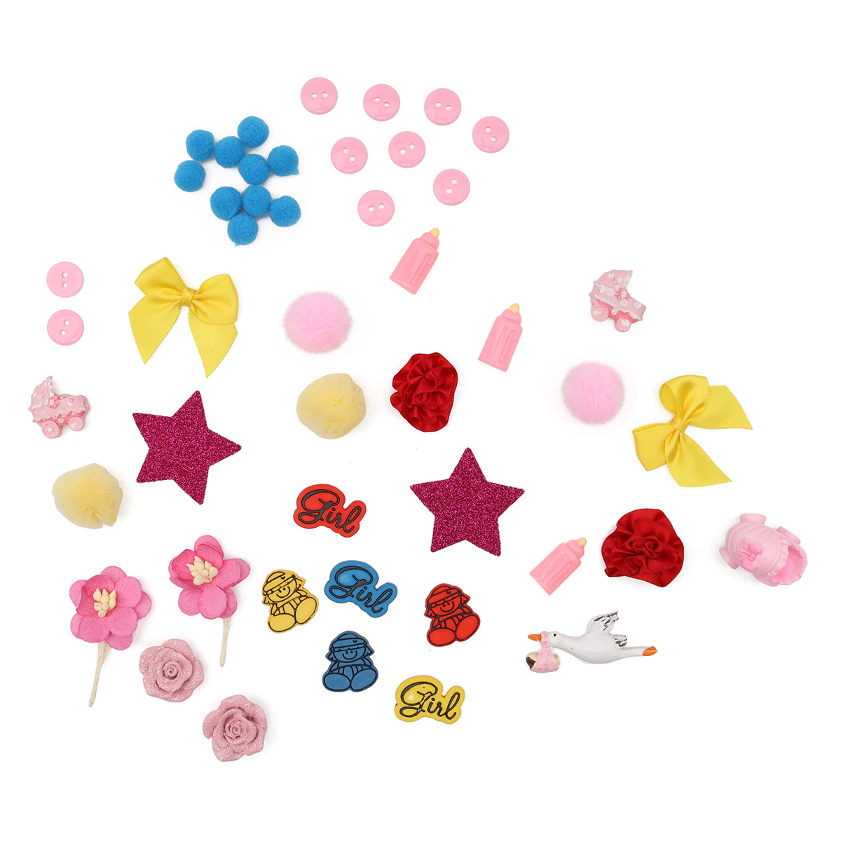 В наборе: пришивные бантики, пришивные цветы, пластиковые декоративные элементы из пластика, цветочки из бумаги, объемные фигурки со стикерами, помпоны, пуговицы.