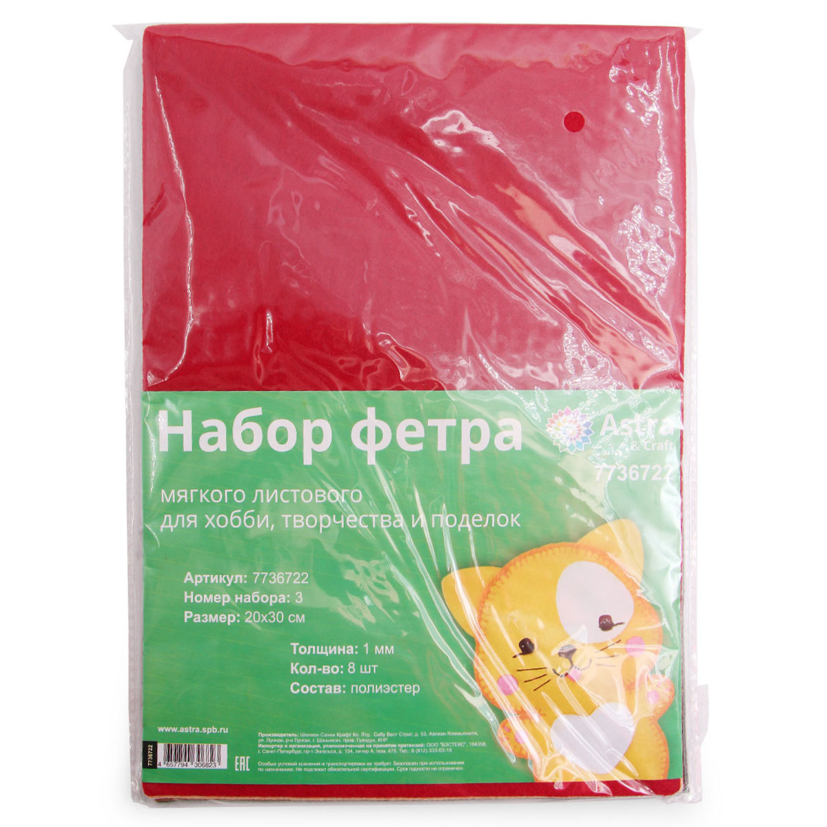 Мягкий листовой фетр от 'Astra&Craft' – практичный материал для творчества. Фетр не осыпается, его легко сшивать или фиксировать на текстильный клей. Благодаря 'волокнистой' фактуре и небольшому ворсу фетр напоминает шерсть, но при этом гигиеничен, не является питательной средой для микроорганизмов и насекомых.