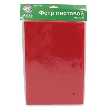 Жесткий листовой фетр Astra&Craft – практичный материал для творчества. Фетр не осыпается, его легко сшивать или фиксировать на текстильный клей. Благодаря 'волокнистой' фактуре и небольшому ворсу фетр напоминает шерсть, но при этом гигиеничен, не является питательной средой для микроорганизмов и насекомых. Яркие цвета привлекают внимание.