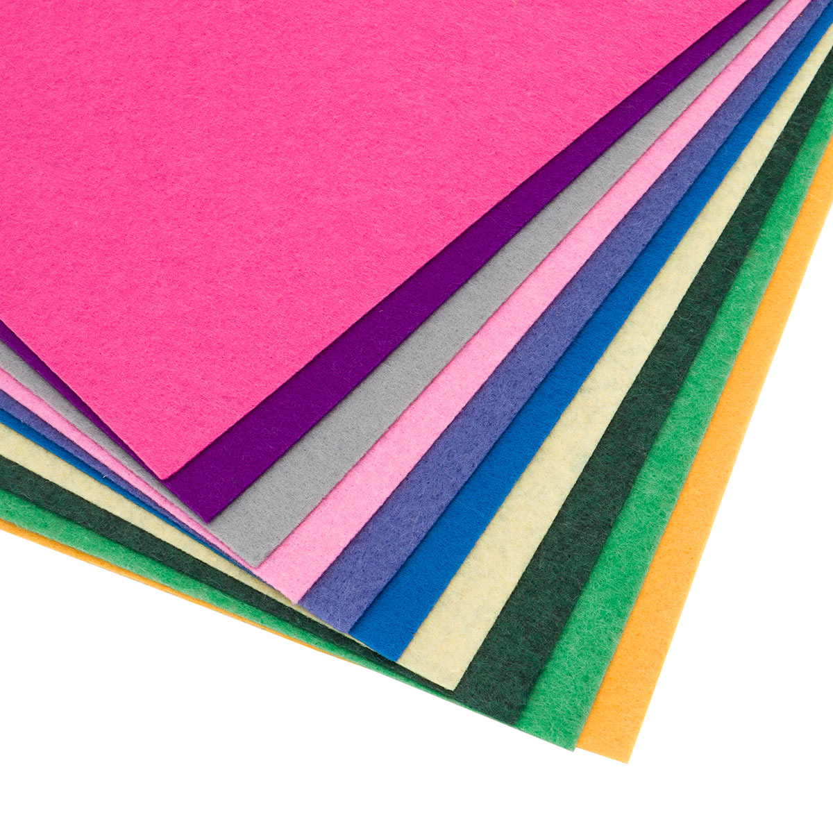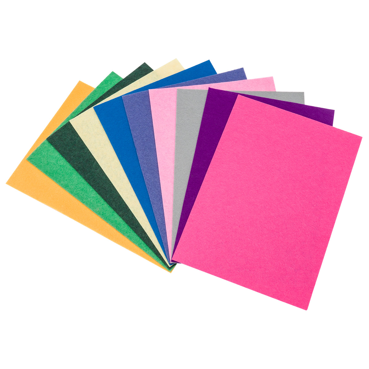 Фетр не осыпается, его легко сшивать или фиксировать на текстильный клей. Благодаря волокнистой фактуре и небольшому ворсу фетр напоминает шерсть, но при этом гигиеничен, не является питательной средой для микроорганизмов и насекомых. Яркие цвета привлекают внимание. Фетр для рукоделия набор состоит из 10 разноцветных листов.