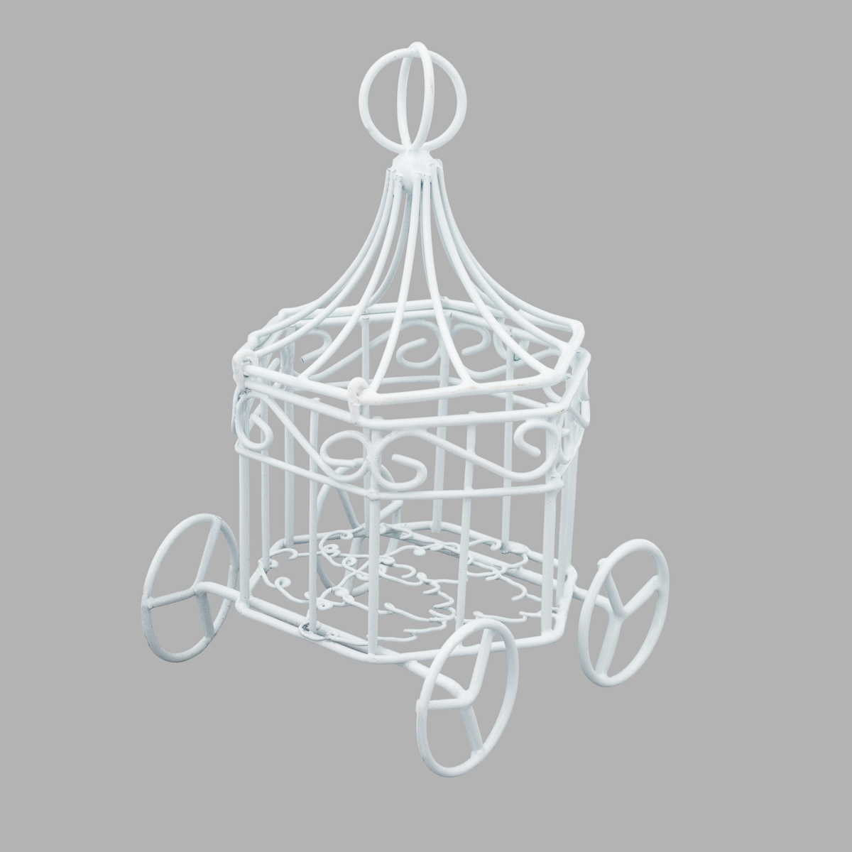 Миниатюрная карета из тонких ажурных металлических прутьев отличается воздушной легкостью и утонченным дизайном. Миниатюра подойдет для создания интерьерных композиций, румбоксов, декоративного оформления кукольных домиков и детских игр.