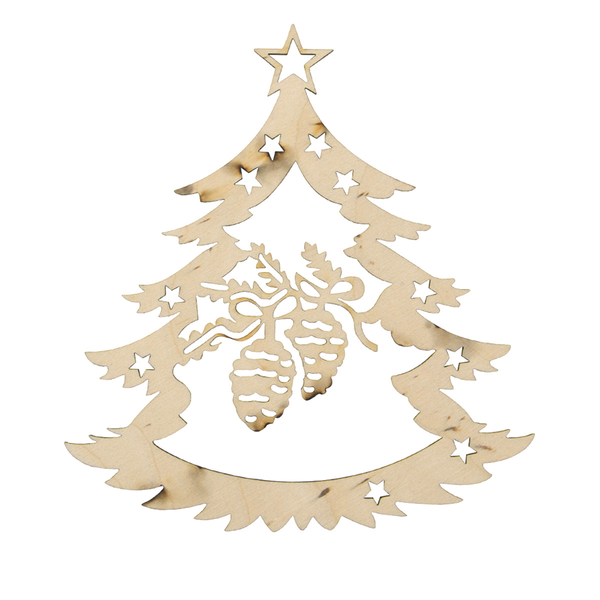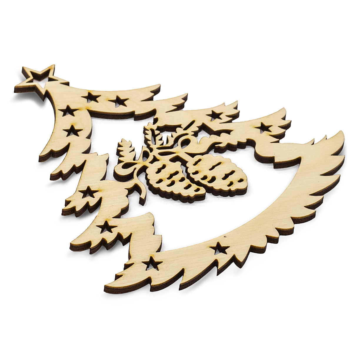 Резная фигурка-подвеска 'Еловые шишки' изготовлена на современном оборудовании из берёзовой фанеры. Фанера – недорогой и неприхотливый материал. Заготовку можно расписать акриловыми красками, фломастерами. При желании добавьте пару объемных деталей: полужемчужины, клеевые стразы. Чтобы фанера не деформировалась от влаги, ее обрабатывают лаком или воском.