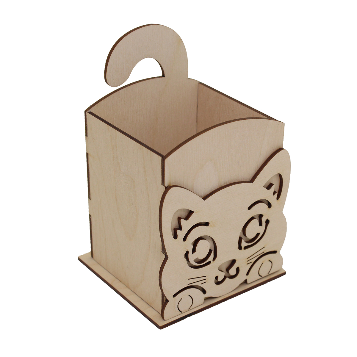 Заготовка карандашницы 'Котенок' Astra&Craft не требует сборки. Изготовлена на современном оборудовании из берёзовой фанеры. Фанера – недорогой и неприхотливый материал. Заготовку можно расписать акриловыми красками, фломастерами. При желании добавьте пару объемных деталей: полужемчужины, клеевые стразы. Чтобы фанера не деформировалась от влаги, ее обрабатывают лаком или воском.