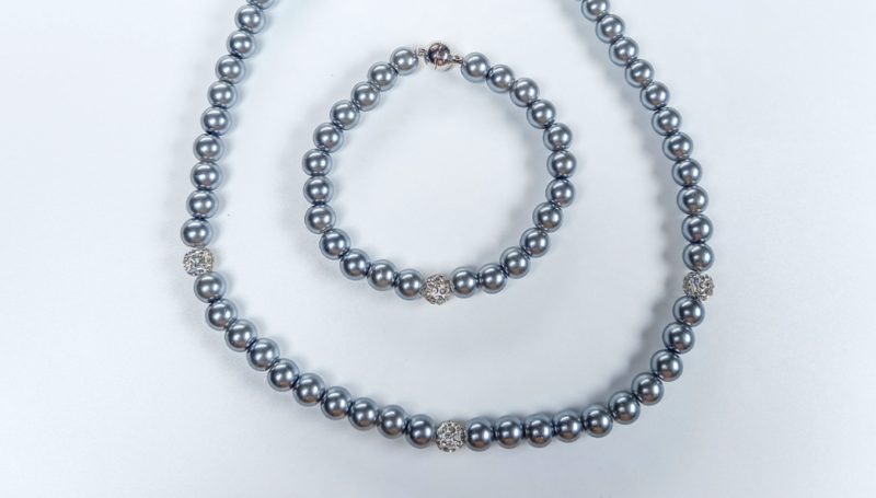 - Шаг 5: Далее аналогично набираем браслет. Прикрепляем на 1 конец нити 1 часть застёжки и набираем 12 жемчужных бусин, бусину со стразами, см. фото 8, и ещё 12 жемчужных бусин, см. фото 9. Закрепляем 2-ю часть застёжки на узелки. Всё, ожерелье и браслет готовы!