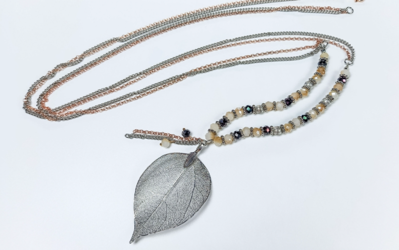 - Шаг 10: Прикрепляем подвеску в виде листочка. Для этого открываем инструментами соединительное колечко и крепим его за оставленное колечко в середине отрезка из бусин, см. фото 21. Нанизываем 2 кусочка цепочек, см. фото 22, закрываем колечко длинногубцами и тонкогубцами, см. фото 23.