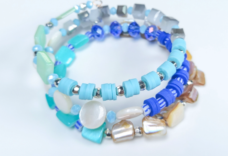 - Шаг 6: Набираем круглые светлые бусины из ракушки, чередуя с голубыми гранёными бусинками, см. фото 11, 12.